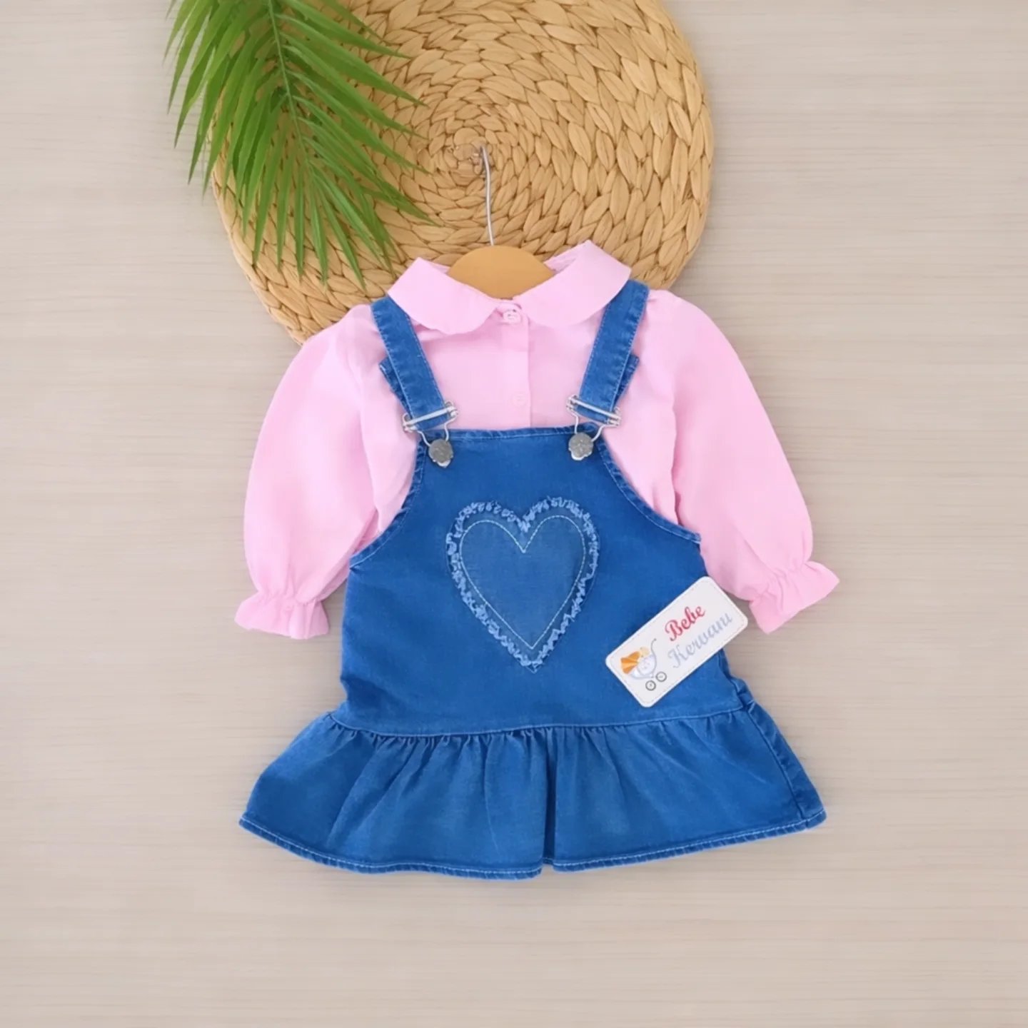 Ana Sayfa Mağaza Bebek Takımları Kalp Temalı %100 Pamuklu Slopetli Kot Elbise